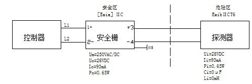 l 安装示意图例:![]() l 安装应按照GB3836.15-2000《爆炸性气体环境用电气设备 第15部分:危险场所电气安装(煤矿除外)》的有关规定进行。 l 每个报警回路使用安全栅的数量不得超过6只。 l 安全栅须取得防爆合格证,其安装应按其说明书的要求进行,并注意正负极性。 l 接线图例: ![]() 本安系统参数匹配须遵循如下原则: Uo ≤ Ui;Io ≤ Ii;Po ≤ Pi;Cc ≤ Co-Ci;Lc ≤ Lo-Li 其中:Cc、Lc:安全栅到探测器之间连接电缆(或导线)允许总的*大分布电容和电感;Uo:安全栅的*高输出电压;Io:安全栅的*大输出电流;Po:安全栅的*大输出功率;Lo:安全栅允许的*大外部电感;Co:安全栅允许的*大外部电容;Ui:探测器的*高输入电压;Ii:探测器的*大输入电流;Pi:探测器的*大输入功率;Li:探测器的*大内部电感;Ci:探测器的*大内部电容。 符号详细意义见GB3836.4-2000标准。 |