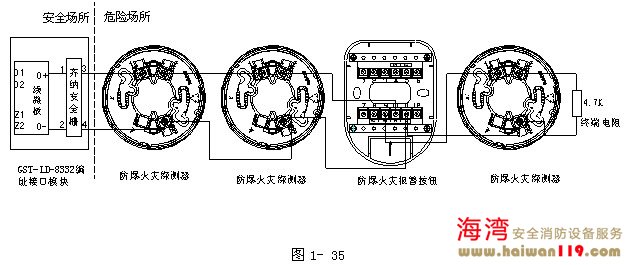 编址接口模块可与防爆的感温火灾探测器、感烟火灾探测器及手动火灾报警按钮一起接入火灾报警控制器系统中组成本安型防爆系统。在系统连线末端必须连接一4.7kΩ终端电阻,且一只编址接口模块混接的各类防爆探测器及报警探测不能超过10只。系统连线如图1- 35所示。