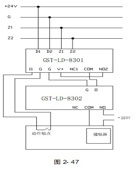 GST-LD-8302切换模块与8301模块配合使用控制交流设备的方法如图2- 47 所示: