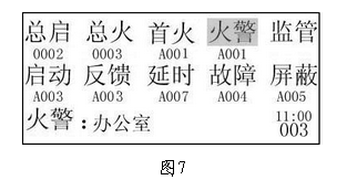 图7 1) 控制器液晶屏显示如上图7所示(按切换键后)的火警信息;