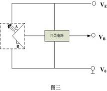 图三所示是光电感烟探测器“光室“的工作原理。图中A为发光元件,B为受光元件,在正常状态下,B无法接收到A发射出的光信号,在烟雾进入到光室后,由于烟粒子的“漫射“作用,使受光元件B接受到发光元件A的光信号,在电路中产生光电流,驱动开关电路,同样也实现了烟信号至电信号的转变。
